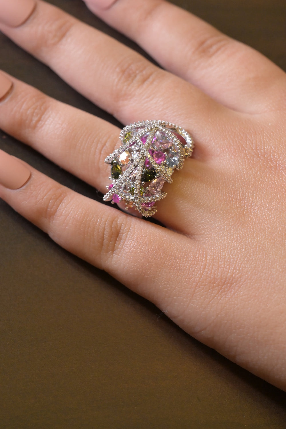 This fashionable, trendy, and statement ring is made from metal alloy, studded with sparkling American diamonds and multicolored gemstones, and made to shine with a high-quality rhodium polish for a glamorous, long-lasting finish