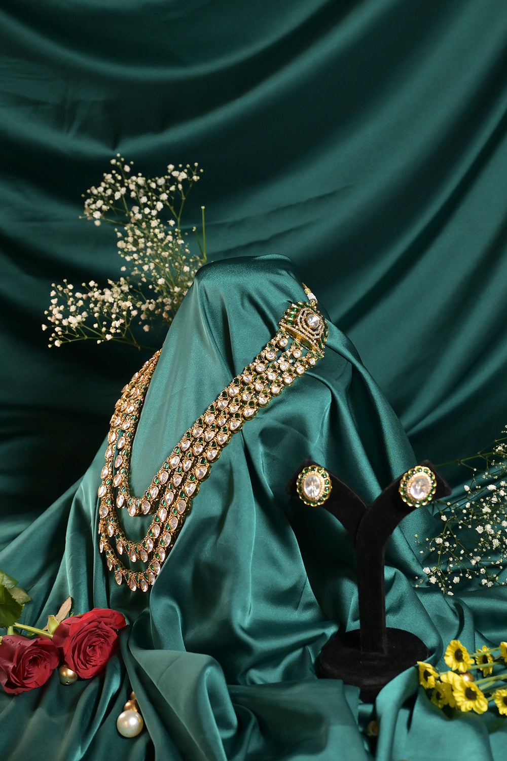 Material: This artificial imitation designer replica polki long layered necklace is made up of metal alloy which has handcrafted polkis and comes with high quality and high grade oxidized golden finish.