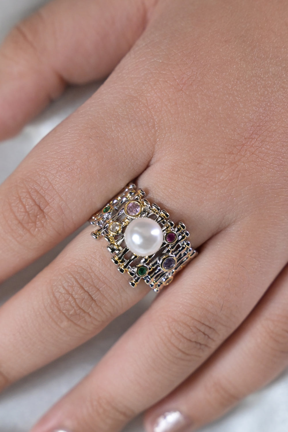 Material: This fashionable, trendy, and statement ring is made from metal alloy and studded with white pearl in the centre and is made to shine with a high-quality oxidized rhodium polish for a glamorous, long-lasting finish.