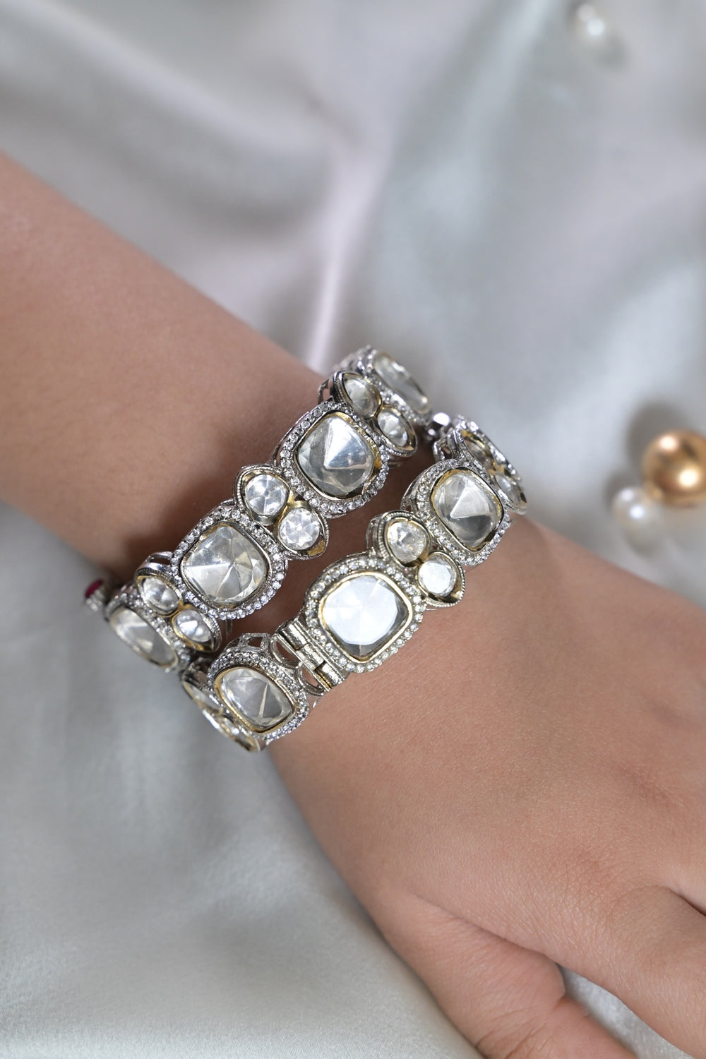 Make a bold yet elegant statement with our Shahana Wedding Polki Diamond Bangles— featuring a stylish indian design adorned with polki stones, diamond gemstones and rhodium plated and fashion-forward, it's perfect for cocktail, weddings ensembles, or festive gatherings. Add this dazzling piece to your jewellery collection for a temple yet refined vibe. This affordable temple bangle is a must-have, ideal for bridal wear, birthday wear, anniversary wear, wedding wear, engagement wear, pooja ceremony wear, cocktail nights, or thoughtful gifting.