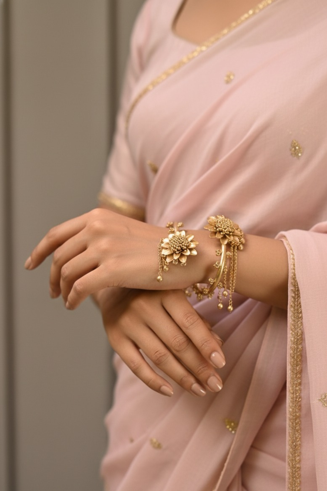 Material: These artificial imitation designer faux gold fashionable trendy bracelets are made of premium-quality metal alloy, beautifully embellished with floral detailing and polished with a high-quality golden finish for a radiant, long-lasting shine