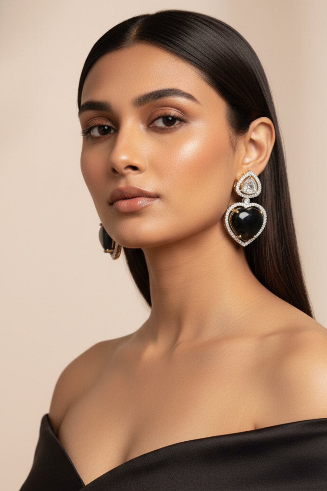 Material: These earrings are made up metal alloy and handcrafted and studded with American Diamonds and colorful single crystal heart-shaped stone in light pink or black and it is made to shine with a high grade and high-quality rhodium polish.