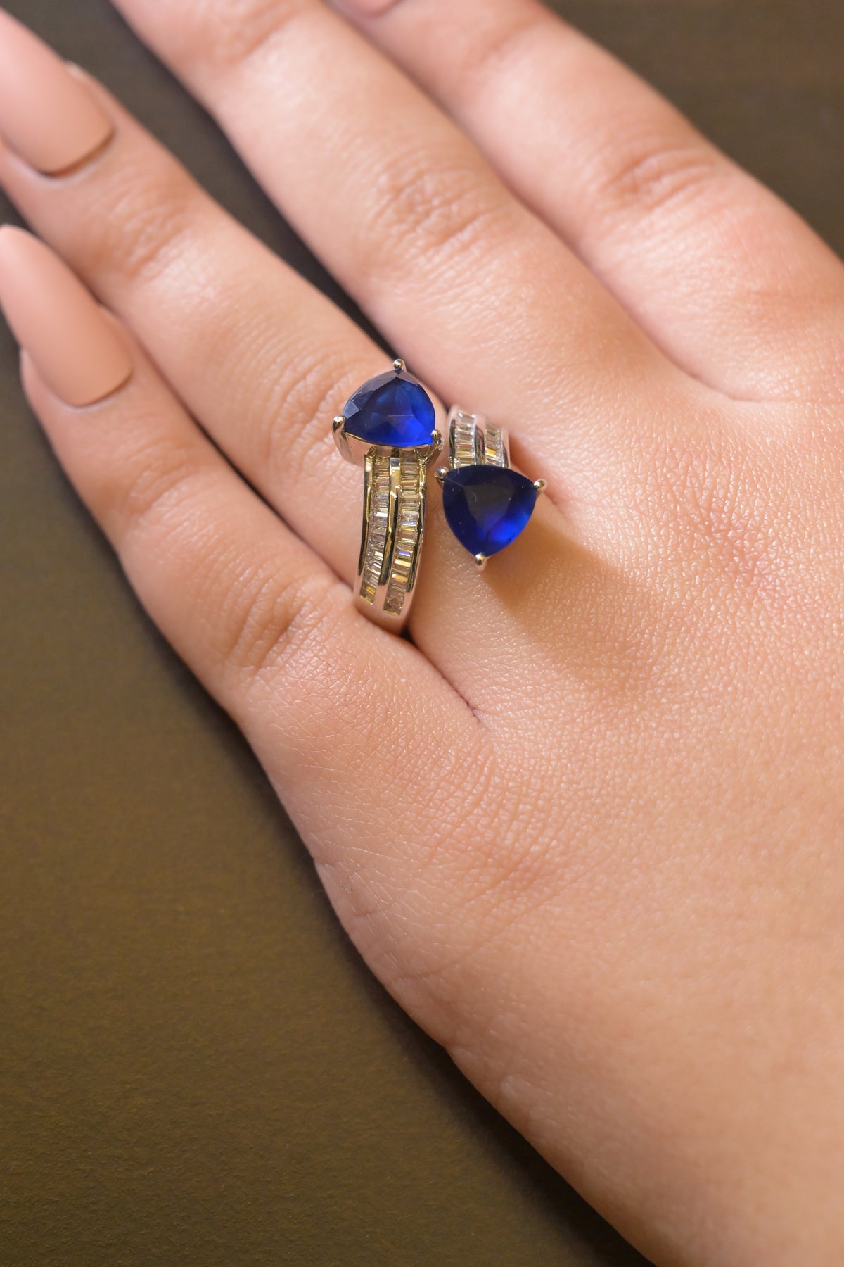 This fashionable, trendy, and statement ring is made from metal alloy, studded with sparkling CZ American diamonds and blue Sapphire/emerald green gemstones, and made to shine with a high-quality rhodium polish for a glamorous, long-lasting finish