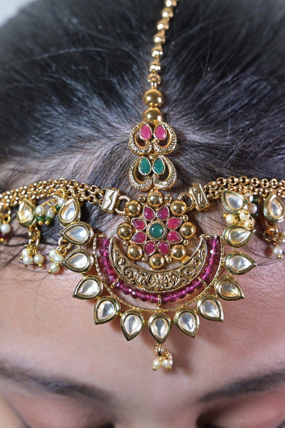 Crafted from high-quality brass alloy and finished with antique gold plating, this broad patti maang tikka is adorned with hand-set kundan-style stones and delicate bead detailing. It is lightweight, nickel-free, and skin-friendly, designed for comfort during long wedding functions or festive events.