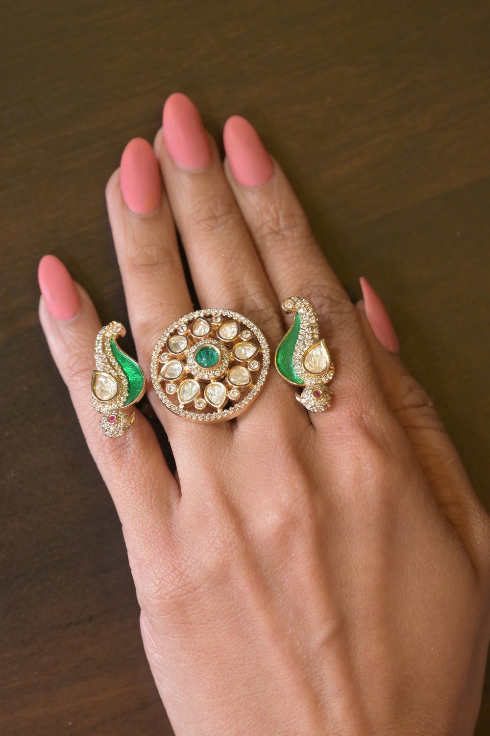 Embrace elegance and flair with the Mayuri Haldi Polki Three-Finger Ring. Featuring a unique Three-Finger design adorned with intricate Polki stones, this ring adds a regal touch to any ensemble. Perfect for occasions like Mehndi, Haldi, Diwali, Eid, Raksha Bandhan, or as a thoughtful gift, it’s a show-stopping piece that combines tradition with modern sophistication.