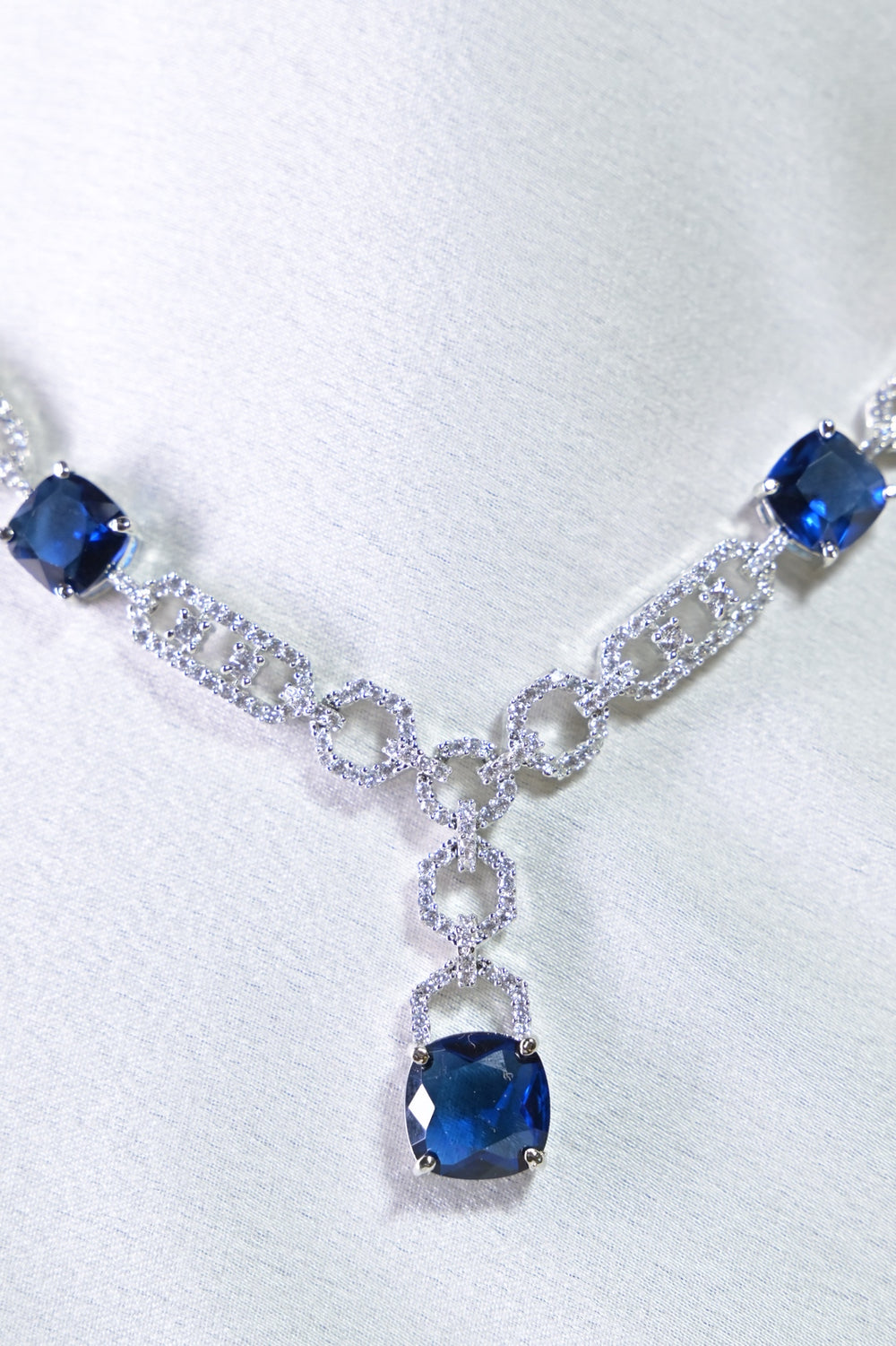 This blue sapphire v-shaped cocktail necklace, Mayur Lightweight Blue Sapphire Diamond Cocktail Necklace is a perfect statement style for any cocktail party, which can be worn by any age groups. It comes with matching cocktail diamond studded high fashion blue sapphire square shaped tear drop lightweight dangler earrings. The american diamonds are arranged in a cluster of v-shaped necklace creating a powerful statement piece.This vintage style necklace is fit to be worn as a contemporary,unique, bohemian, bollywood-inspired, festival-ready, jewellery piece to wear to any wedding, sangeet, cocktail, engagement, mehndi, haldi, anniversary, gifting purposes. It is a perfect wedding wear which has the perfect blend of heritage and elegance for the modern bride, or bride's mother, or groom's mother or sister.