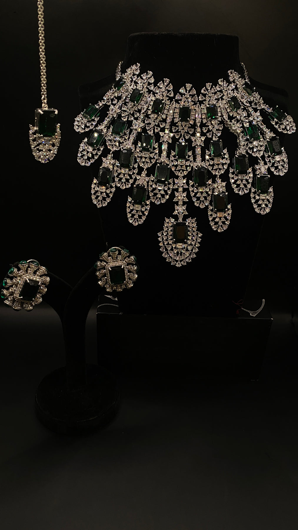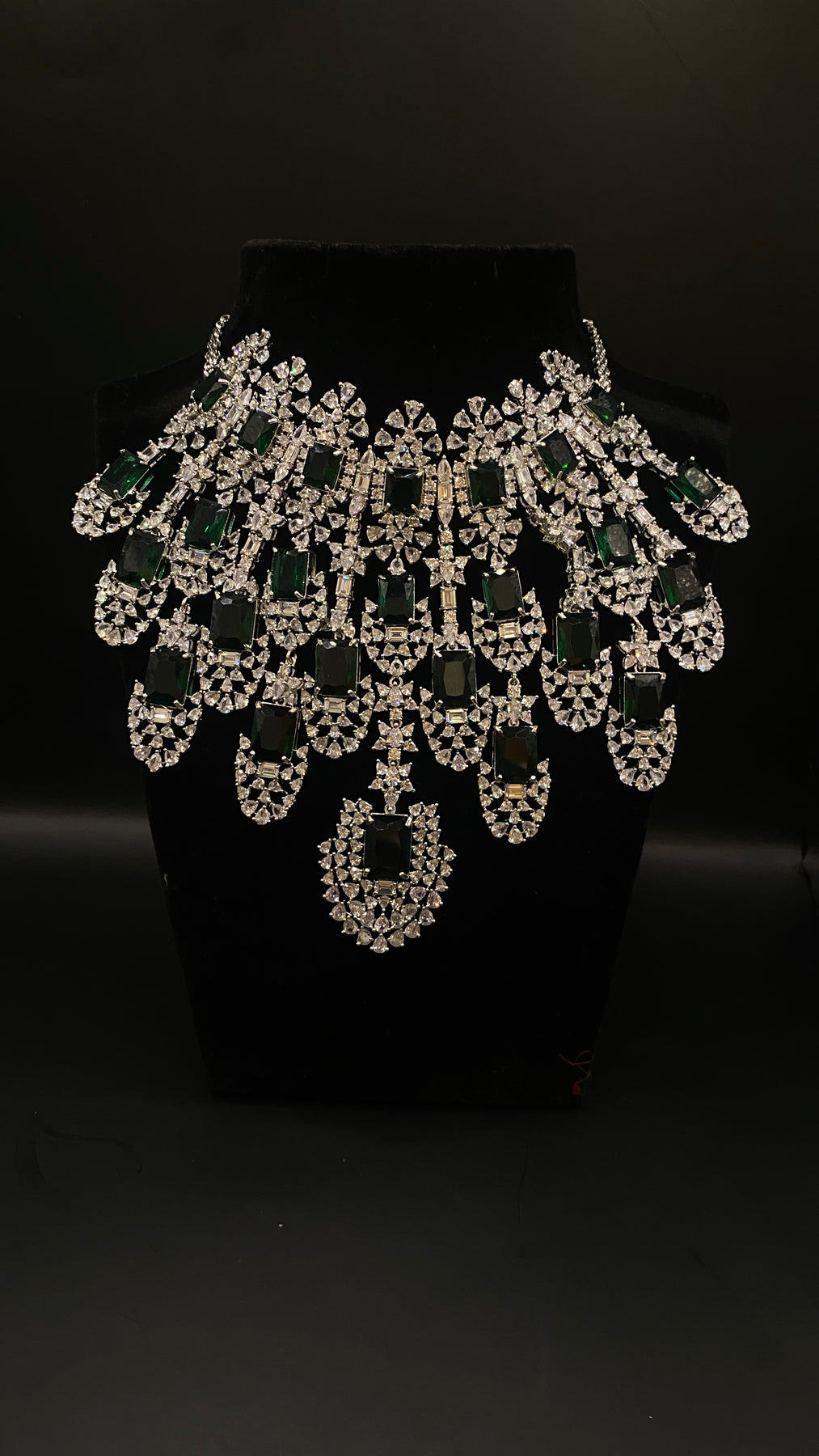 This layered and signature style ,Rajwadi Statement Cocktail Diamond Necklace , is studded with American Diamonds/ CZ Diamonds,comes with matching diamond earrings and sapphire emerald gemstones cluster. It is a perfect blend of heritage and elegance for the modern bride suitable to give her a fancy statement and luxury vibes. The american diamonds in this necklace are arranged in a stroke pattern, creating a powerful statement piece.This vintage style necklace is fit to be worn as a contemporary,unique, bollywood-inspired, festival-ready, jewellery piece to wear to any wedding, sangeet, cocktail, engagement, mehndi, haldi, anniversary, gifting purposes. It is a perfect wedding wear which has the perfect blend of heritage and elegance for the modern bride, or bride's mother, or groom's mother or sister.Â