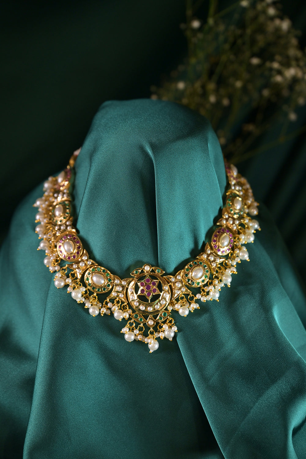 Make a bold statement with our RajMaitreyi Multicolored Jadau Necklace, featuring vibrant Navratna gemstones, elegant pearls, and multicolored hangings that exude opulence. This exquisite piece is paired with matching danglers, creating a harmonious look that radiates timeless beauty. It is a bridal jewellery multicolored long necklace, designed for the brides or bride's mother or groom's mother who loves tradition with a touch of grandeur. It is a signature style necklace which is straight out of bollywood movies. This antique style necklace is fit to be worn as a contemporary,unique, bohemian, bollywood-inspired, festival-ready, jewellery piece to wear to any wedding, sangeet, cocktail, engagement, mehndi, haldi, anniversary, gifting purposes.