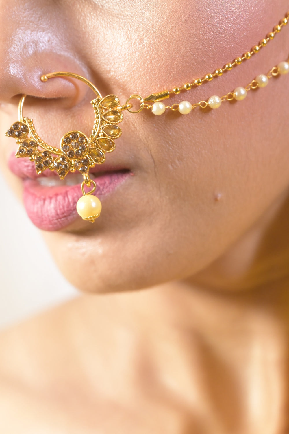 Material: This fashionable, handcrafted, artificial, imitation, designer, exquisite wedding, faux kundan nosering is made up of metal alloy and is handcrafted with embedded kundan and pearl drops and has high quality copper polish and finish.