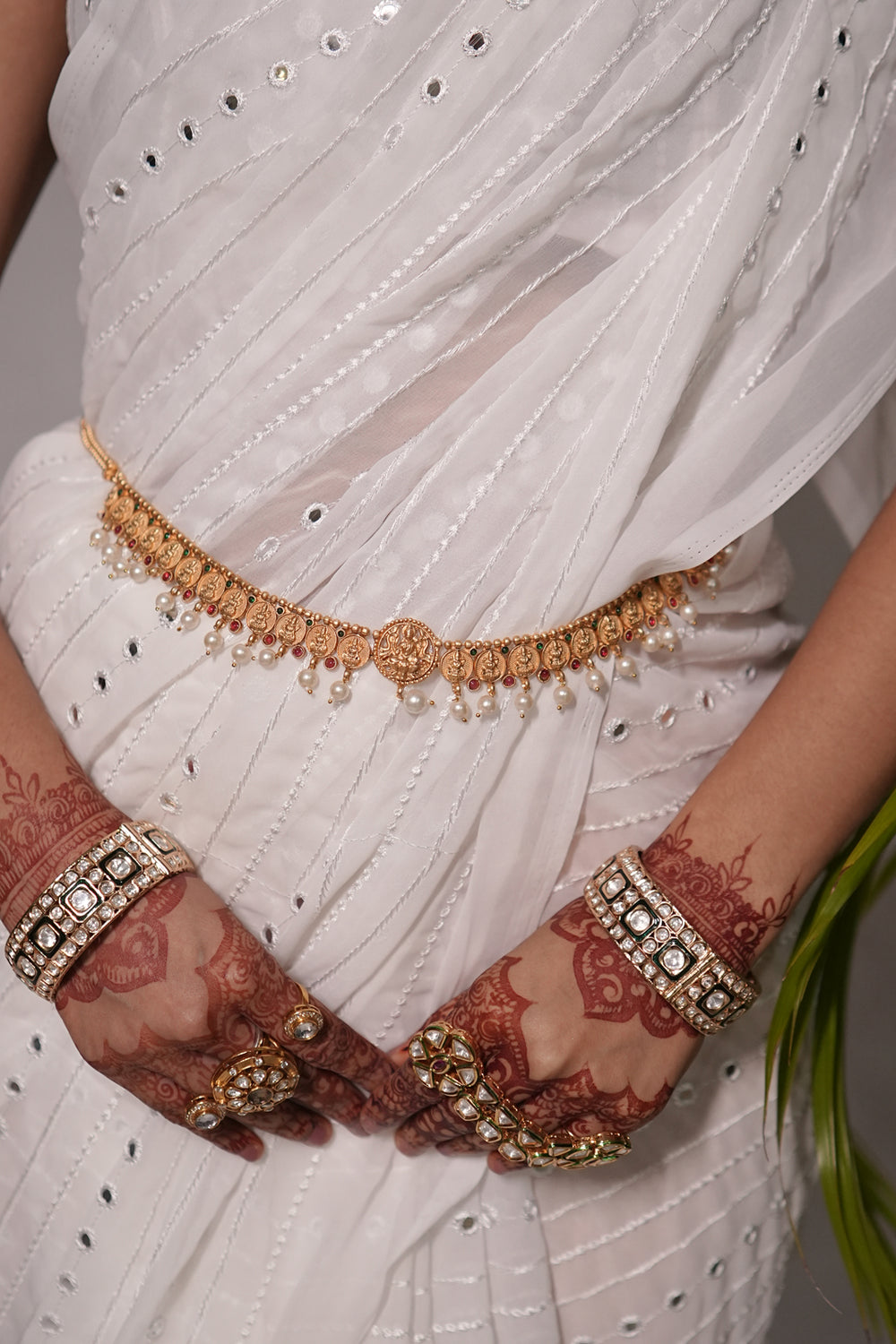 Enhance your traditional look with a beautiful temple style kamarbandh, featuring Maa Lakshmi motifs. Add sparkle to your look with a stunning Anantshri Golden Pearl Drop Temple Kamarbandh, adorned with polki and kundan with pearl drops. Designed to fit all sizes, it the perfect piece for any occasion. Make your wedding or any celebration unforgettable with our kamarband. Whether you're the bride or bridemaids looking to add a regal touch to your haldi, mehendi, sangeet, enagement, annniversary, karwachauth or wedding day look, or a bridesmaid aiming for coordinated elegance, this statement wrist accessory blends tradition, trend, and timeless beauty,being affordable, lightweight, sleek, classy, minimalistic, designer, artistic, statement at the same time.