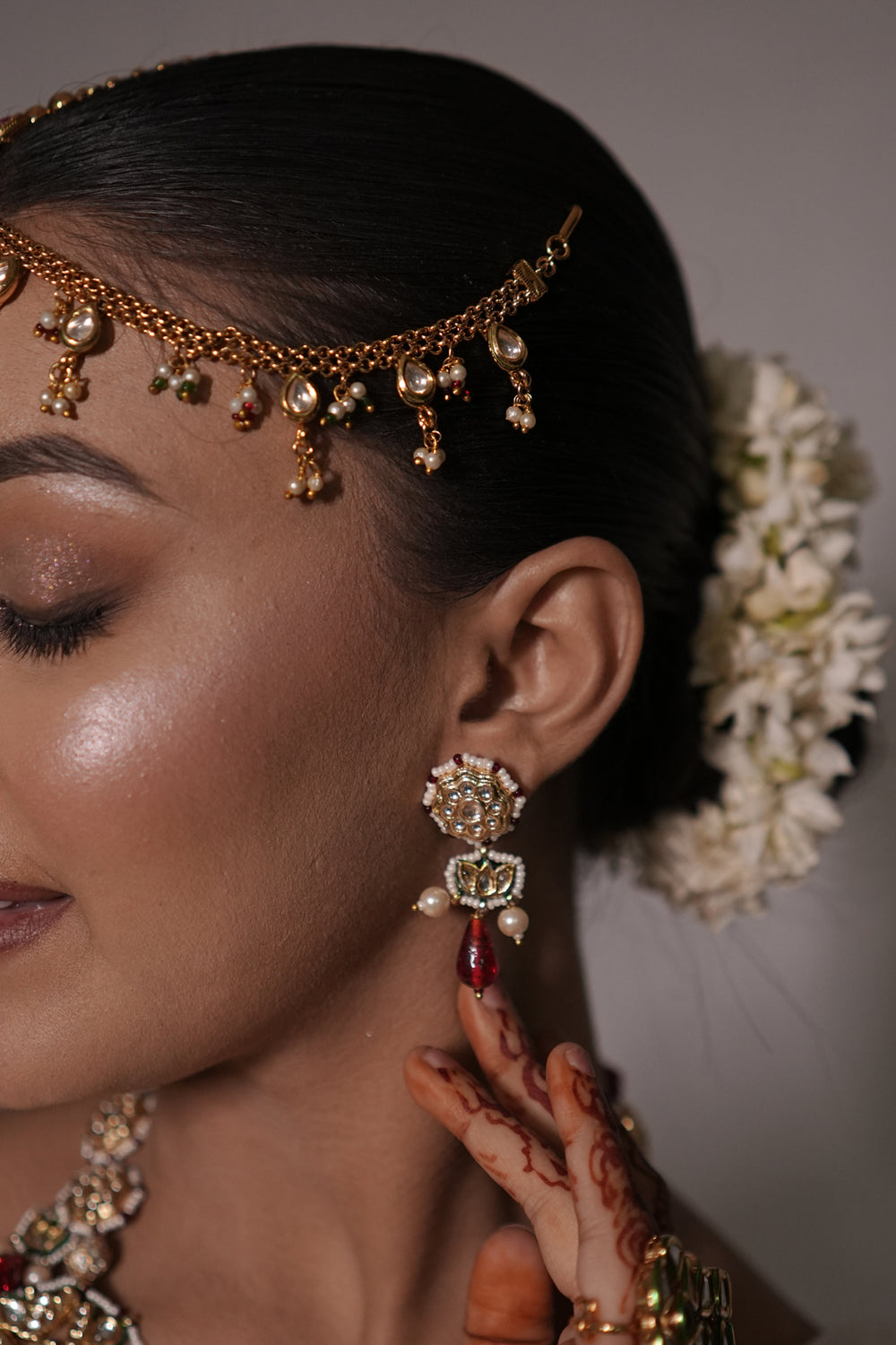 Add a bold and beautiful touch to your bridal look with the Vaidehi Temple Bridal Maangtikka – a statement maang tikka designed to reflect royal elegance and traditional charm. Featuring a grand chandbali-style pendant and a wide patti (forehead band), this maang tikka frames the face with exquisite detail and cultural richness, making it perfect for brides, bridesmaids, or festive celebrations.