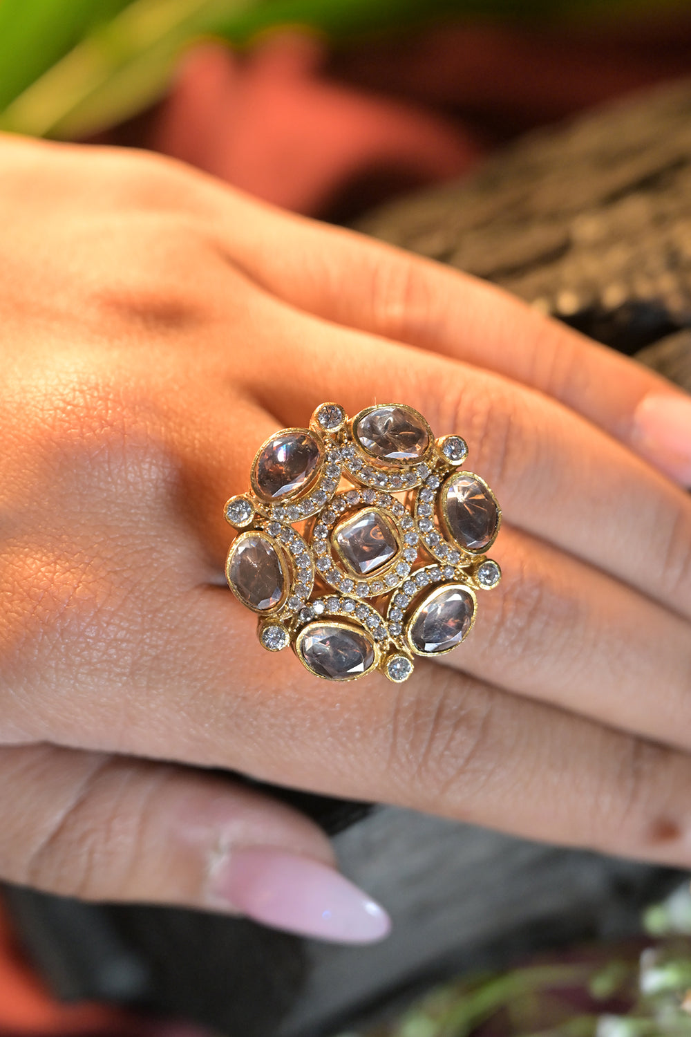 This artificial imitation designer faux gold, fashionable, trendy, statement, stylish, and handmade ring is made from durable metal alloy, studded with Polki stones, and finished with a high-quality gold polish.