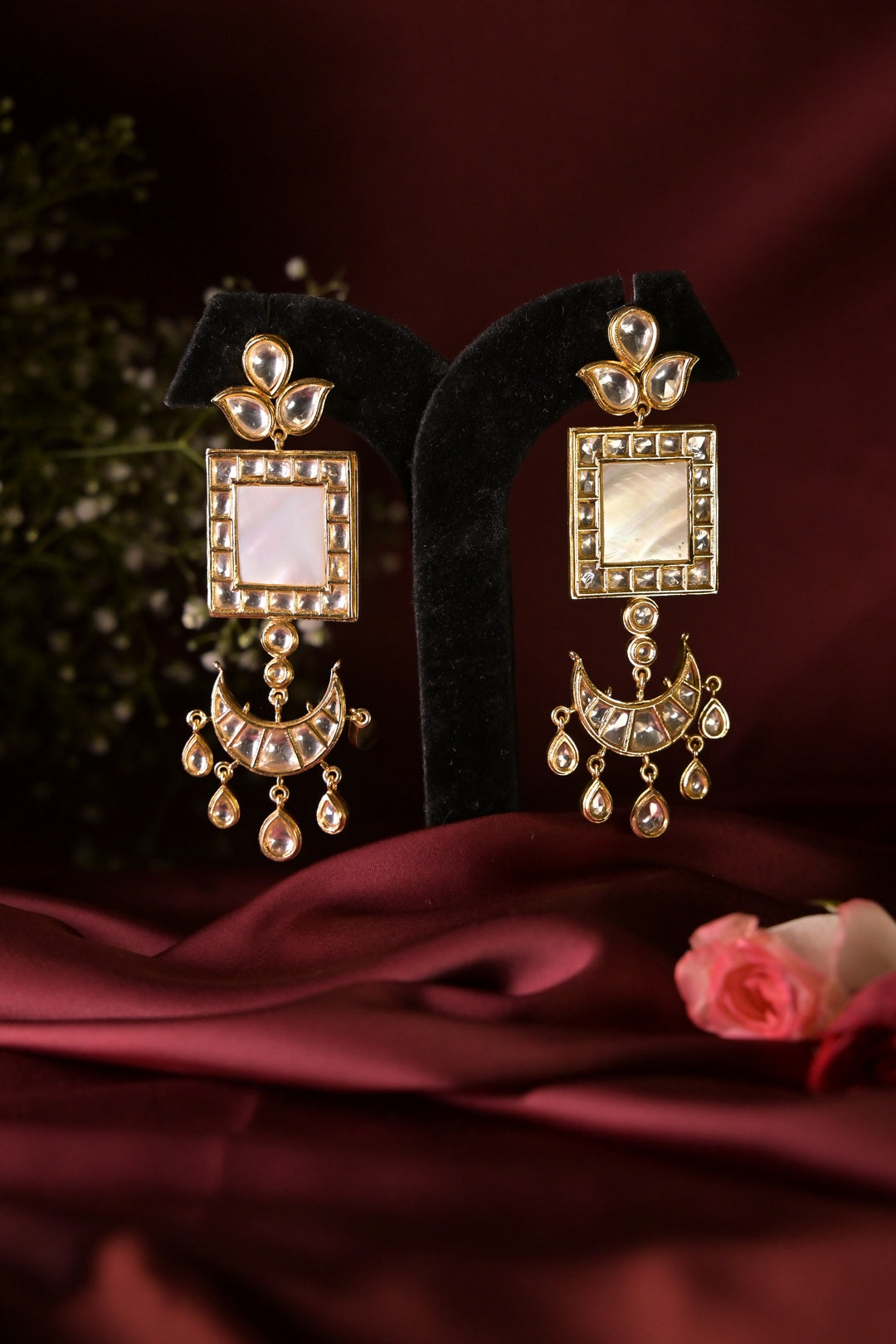 Material: This artificial designer imitation polki dangler with white square-shaped enamel stone, which comes with moon-shaped hangings, has gold plating or finish.