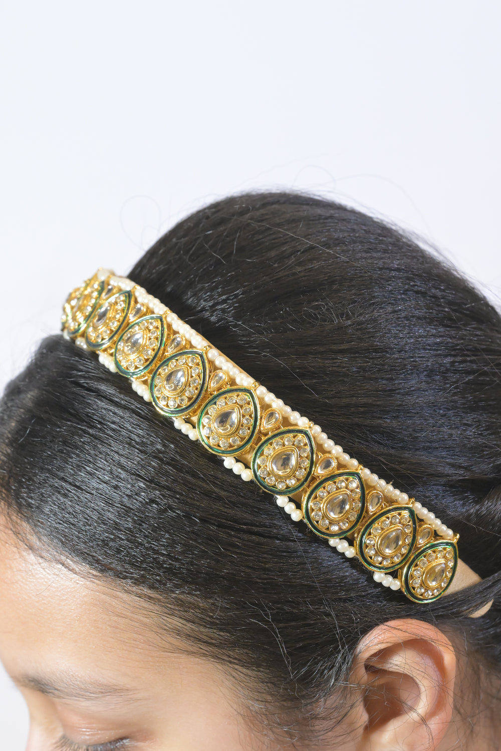 Buy online our bold, traditional, statement, partywear, lightweight, glamourous- PAISLEY GREEN KUNDAN PEARL HEADBAND to adorn your hairs. Perfect for ponytails, braids, or open hairstyles, these pieces bring timeless elegance and shine to any celebration be it evening party, weddings, bridal event, bridemaids, mehndi, sangeet, engagement, anniversary, haldi, pooja ceremony or if required for gifting purposes.