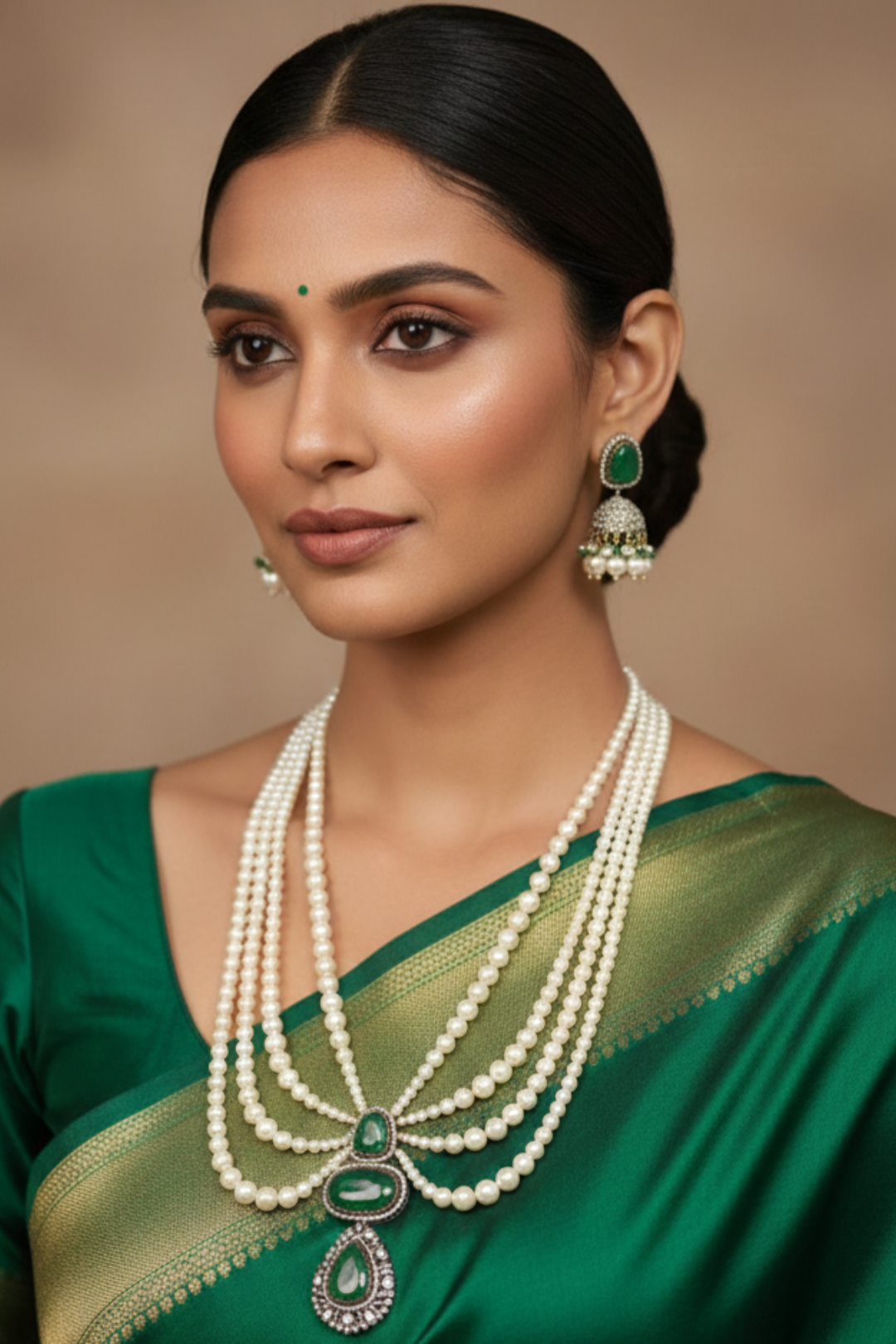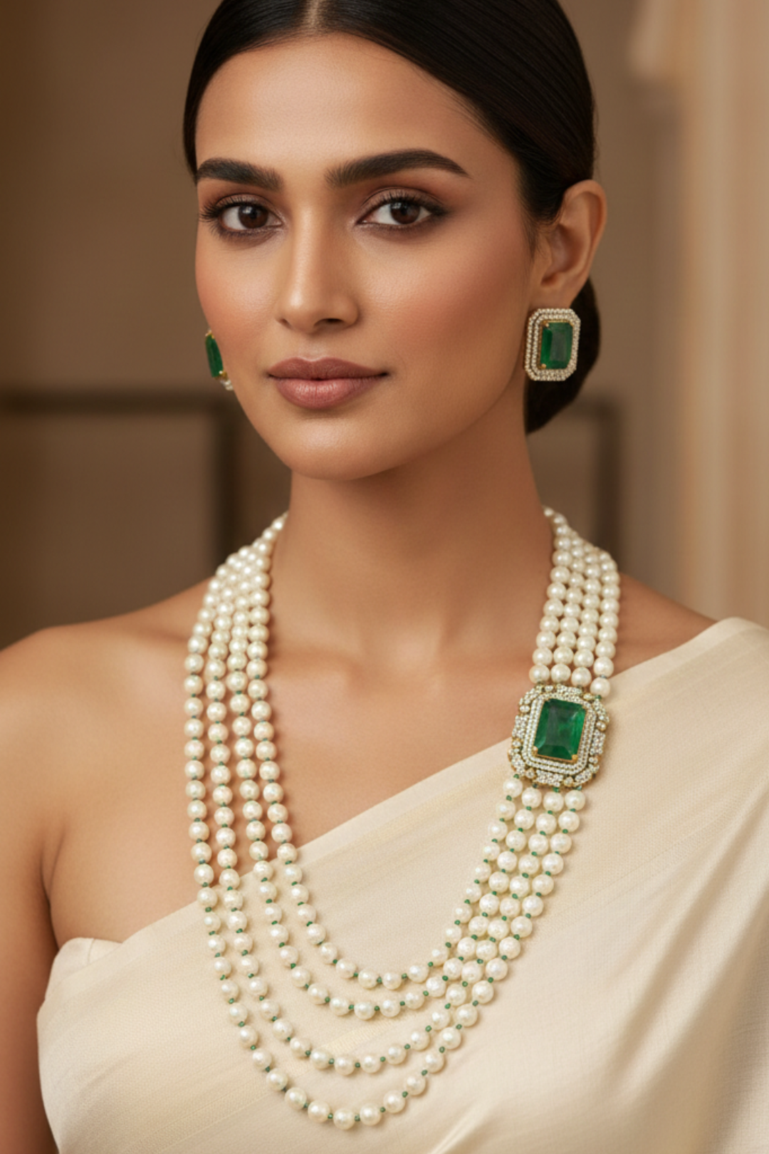 Maharani Javitri Emerald Pearl Premium Layered Long Necklace