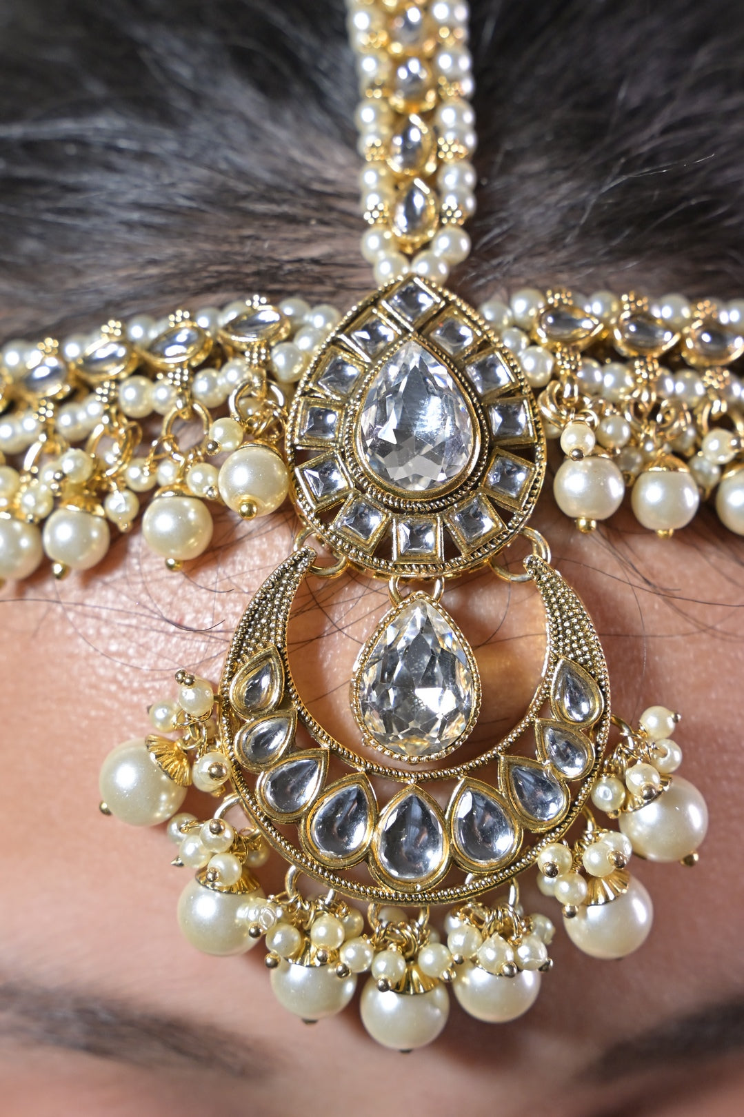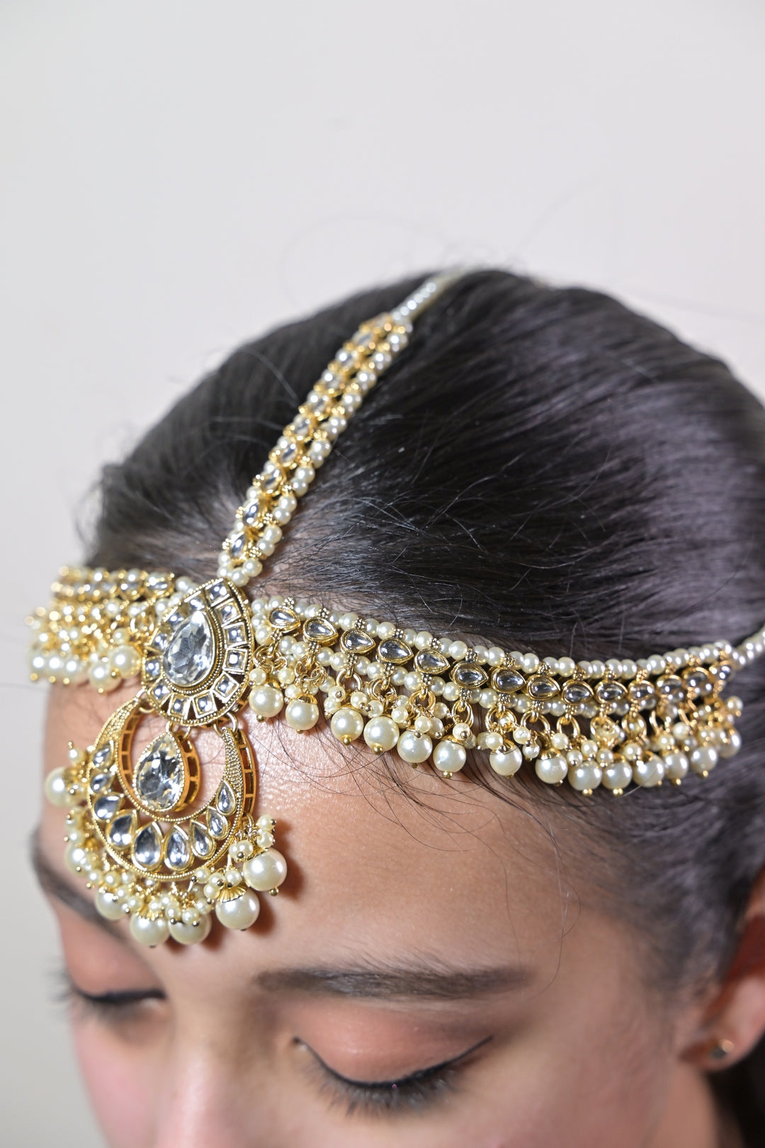 Crafted from high-quality brass alloy and finished with antique gold plating, this broad patti maang tikka is adorned with hand-set kundan-style stones and delicate bead detailing. It is lightweight, nickel-free, and skin-friendly, designed for comfort during long wedding functions or festive events.
