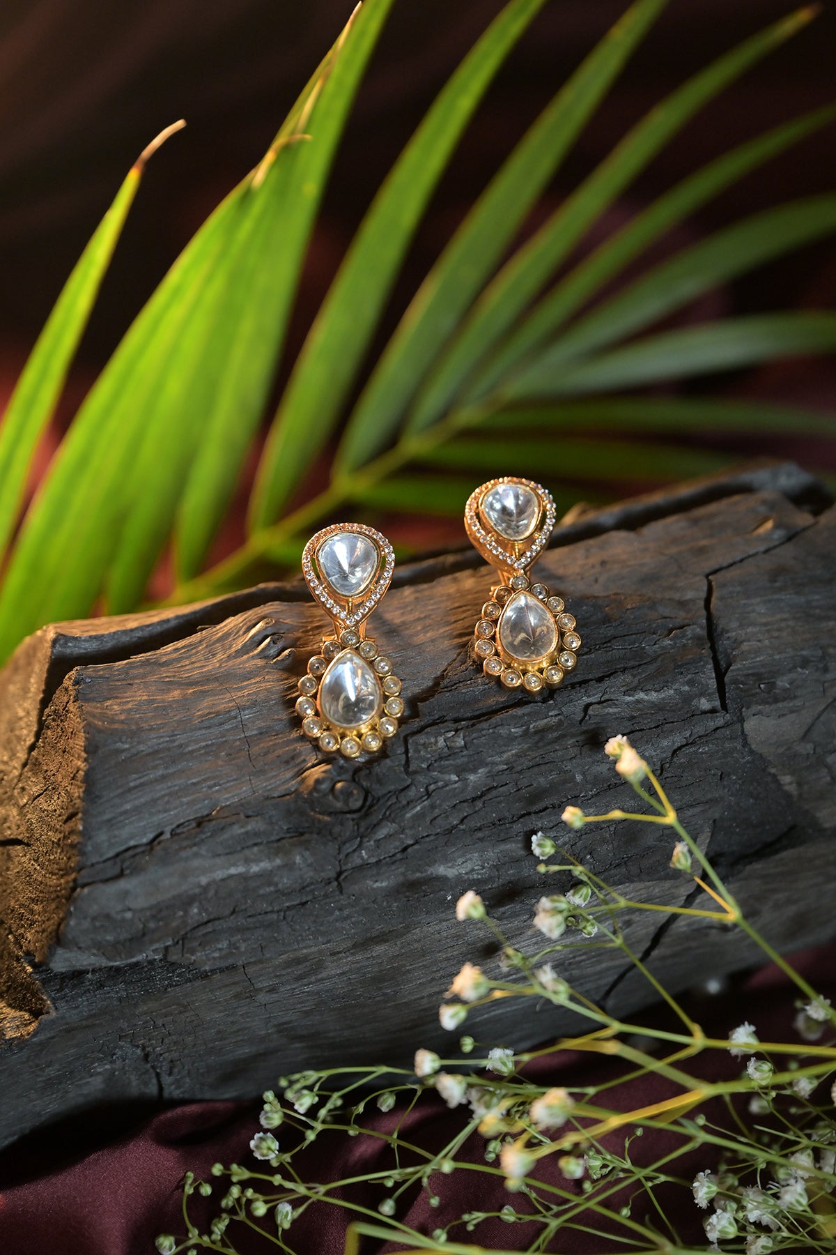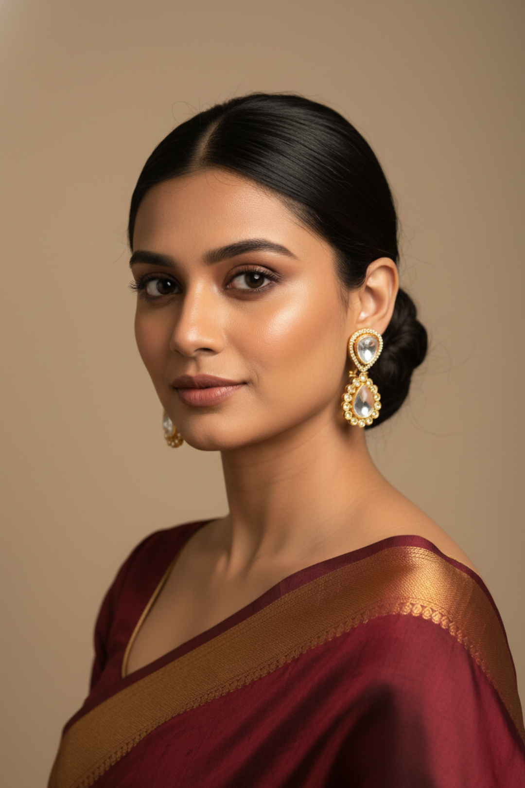 Material: These artificial imitation designer earrings are made of high-quality metal alloy and adorned with delicate Kundan detailing. Crafted in a refined, minimal style and finished with a radiant gold polish, these earrings are embellished with soft-toned stones that add just the right touch of graceful sparkle.