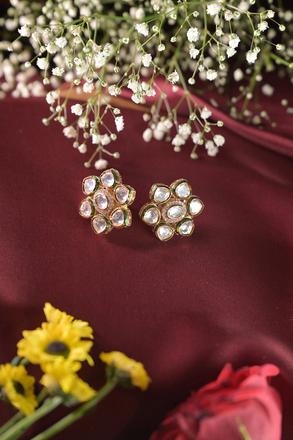 Material: These artificial imitation designer earrings are made of high-quality metal alloy and adorned with exquisite Polki craftsmanship. Designed in a classic stud silhouette, they are finished with a radiant gold polish.