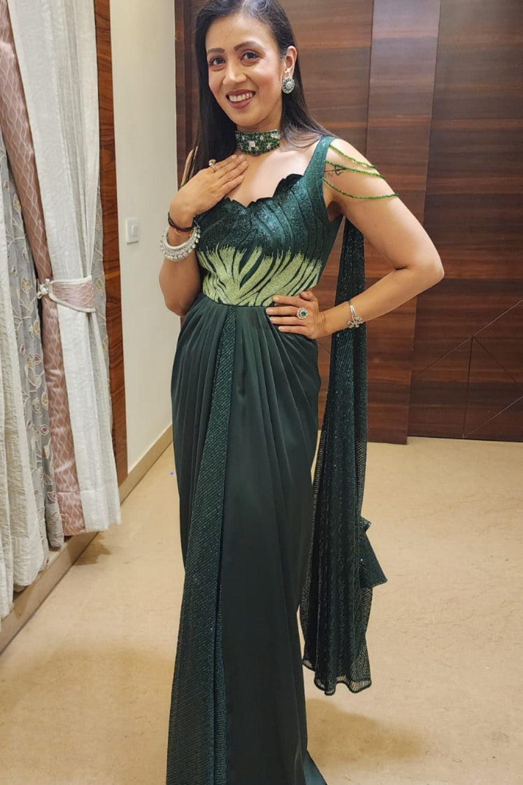 A Symphony of Emerald and Diamonds - The emerald Green-studded American diamond choker called Flora Emerald Green Diamond Chokar Necklace, comes along with big circular geometric pattern studs featuring bold, traditional, festive,elegant, minimalistic creating a powerful statement piece.This vintage style necklace is fit to be worn as a contemporary,unique, lightweight, modern, bollywood-inspired, festival-ready, jewellery piece to wear to any wedding, sangeet, cocktail, engagement, mehndi, haldi, anniversary, gifting purposes. It is a perfect wedding wear which has the perfect blend of heritage and elegance for the modern bride, or bride's mother, or groom's mother or sister.