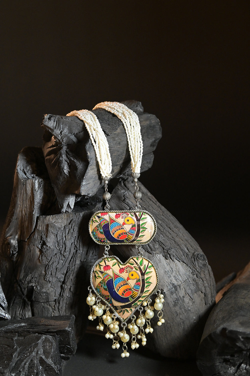 Crafted from an oxidised silver-tone alloy, this necklace features two intricately hand-painted enamel pendants adorned with traditional Madhubani artwork. The design is highlighted with delicate faux pearl and bead danglers that add movement and ethnic charm. It is strung on a soft, multi-strand cotton thread, offering both durability and comfort with an adjustable closure for a perfect fit.