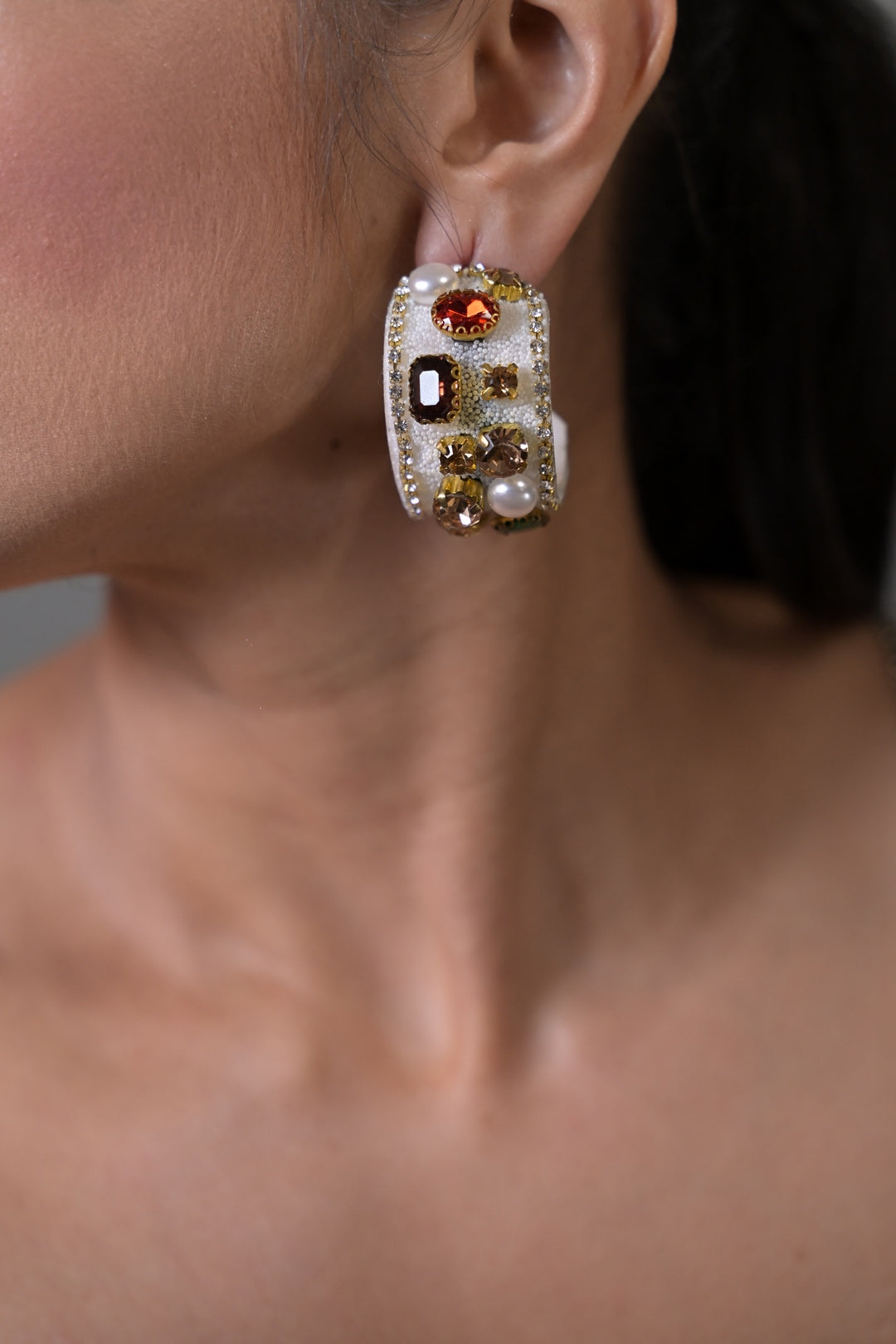Solace Multicolored Gemstone Half Club Hoop Earrings are the perfect pick for office wear, college styling, daily wear, and casual brunches. These lightweight and trendy half hoop earrings feature a sleek golden base shaped in a unique club design, delicately embellished with multicolored gemstones that add a lively yet elegant touch to your everyday look.